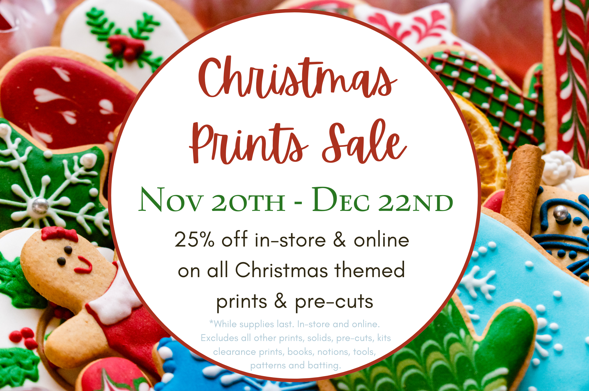 | Details: | 25% off in-store & online on all Christmas themed prints and precuts *While supplies last. In-store and online. Excludes all other prints, solids, pre-cuts, kits clearance prints, books, notions, tools, patterns and batting. |